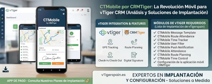 Implementar una solución de este calibre requiere precisión técnica para que la sincronización sea perfecta y los datos de geolocalización sean fiables. En vTigerspain somos especialistas en la implantación de la suite de CRMTiger.