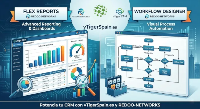 Hoy en vTigerSpain os presentamos dos joyas de la corona del fabricante alemán REDOO-NETWORKS: Flex Reports y Workflow Designer. Herramientas que no solo mejoran el CRM, sino que transforman la forma en que gestionas tus procesos.